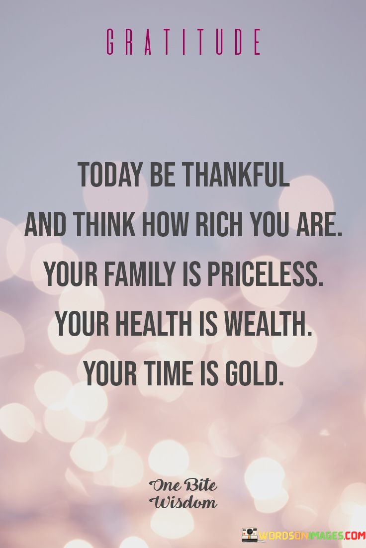 "Today Be Thankful and Think How Rich You Are; Your Family Is Priceless, Your Health Is Wealth, Your Time Is Gold" encapsulates the idea of acknowledging the significance of family, health, and time. It implies that these elements contribute to a rich life. The phrase underscores the importance of perspective and gratitude.