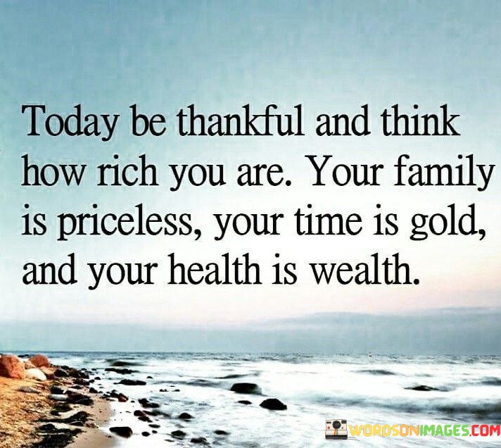 This sentiment encourages recognizing life's true treasures. "Today be thankful and think how rich you are. Your family is priceless, your time is gold, and your health is wealth" prompts appreciation for loved ones, time, and well-being. It underscores the transformative power of valuing the things that truly matter.