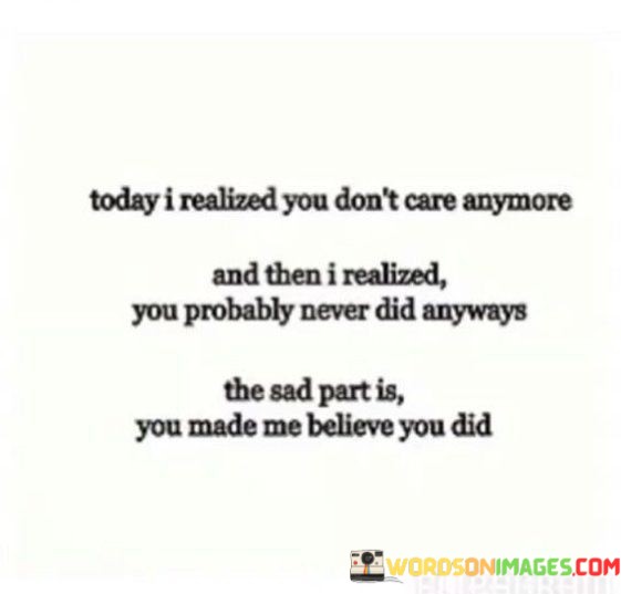 The quote expresses a realization of emotional detachment. "Don't care anymore" implies a shift in attitude. "Never did" suggests past insincerity. The quote underscores the disillusionment in discovering that the person's caring demeanor was likely an illusion.