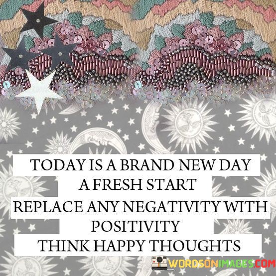 "Today Is A Brand New Day, A Fresh Start. Replace Any Negativity with Positivity, Think Happy Thoughts" encourages a positive outlook. In the first paragraph, the quote highlights the potential of a new day. It emphasizes the opportunity for a fresh beginning.