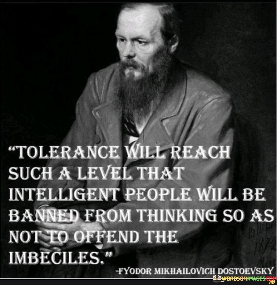 This thought-provoking quote highlights the potential dangers of excessive tolerance in society. In the first paragraph, it suggests that tolerance may be taken to an extreme where even intelligent individuals are discouraged from expressing their thoughts to avoid offending those with lesser understanding or wisdom.
