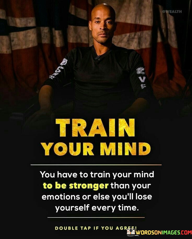 The quote "Train your mind, you have to train your mind to be stronger than your emotions, or else you will lose yourself every time" emphasizes the critical importance of mastering one's emotions and cultivating mental strength. It highlights the power of the mind in navigating life's challenges and preventing emotional reactions from overwhelming our judgment and well-being. Our emotions play a significant role in shaping our experiences and responses to various situations. However, when we allow our emotions to control us, we may react impulsively and irrationally, leading to regrettable decisions or emotional distress. Therefore, training the mind to be stronger than our emotions is essential for maintaining inner stability and resilience. Training the mind involves developing emotional intelligence, self-awareness, and mindfulness. It requires recognizing our emotional triggers and patterns, understanding the root causes of our reactions, and learning to respond thoughtfully rather than reactively. By cultivating emotional intelligence, we gain better control over our feelings and behaviors. Moreover, mental strength is built through practice and discipline. It involves consciously choosing to focus on positive and constructive thoughts, even in challenging circumstances. It means developing the ability to let go of negative emotions and refocus our attention on solutions and personal growth. Furthermore, training the mind empowers us to embrace change and uncertainty with a positive mindset. Rather than succumbing to fear or anxiety, a strong mind seeks opportunities for learning and growth in every situation. It helps us approach life's ups and downs with resilience and adaptability.