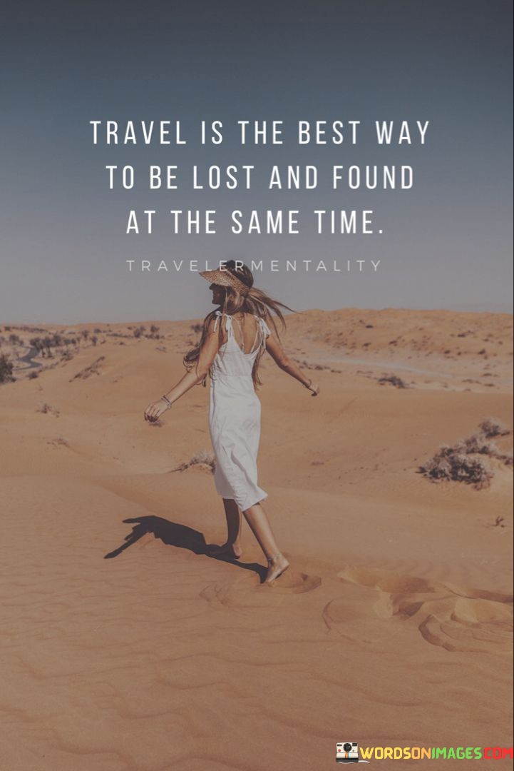 In essence, the quote celebrates the duality of travel—the simultaneous feeling of being lost in the unknown and the profound sense of self-awareness and belonging that can emerge from the journey. It underscores the idea that travel offers a unique opportunity to embrace both the adventure of the unknown and the revelation of self. "Travel is the best way to be lost and found at the same time" encourages individuals to open themselves up to the transformative power of exploration, allowing for both external discovery and internal reflection