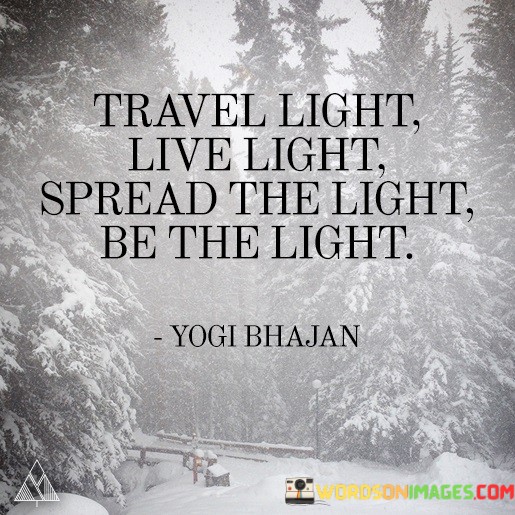 "Travel Light Live Light Spread The Light Be The Light" imparts a profound philosophy of simplicity and positivity. While traveling, the quote suggests carrying minimal physical baggage. Such simplicity extends to life, advocating for a minimalist and unburdened existence. By radiating positivity and kindness, one becomes a source of light, illuminating others' paths.