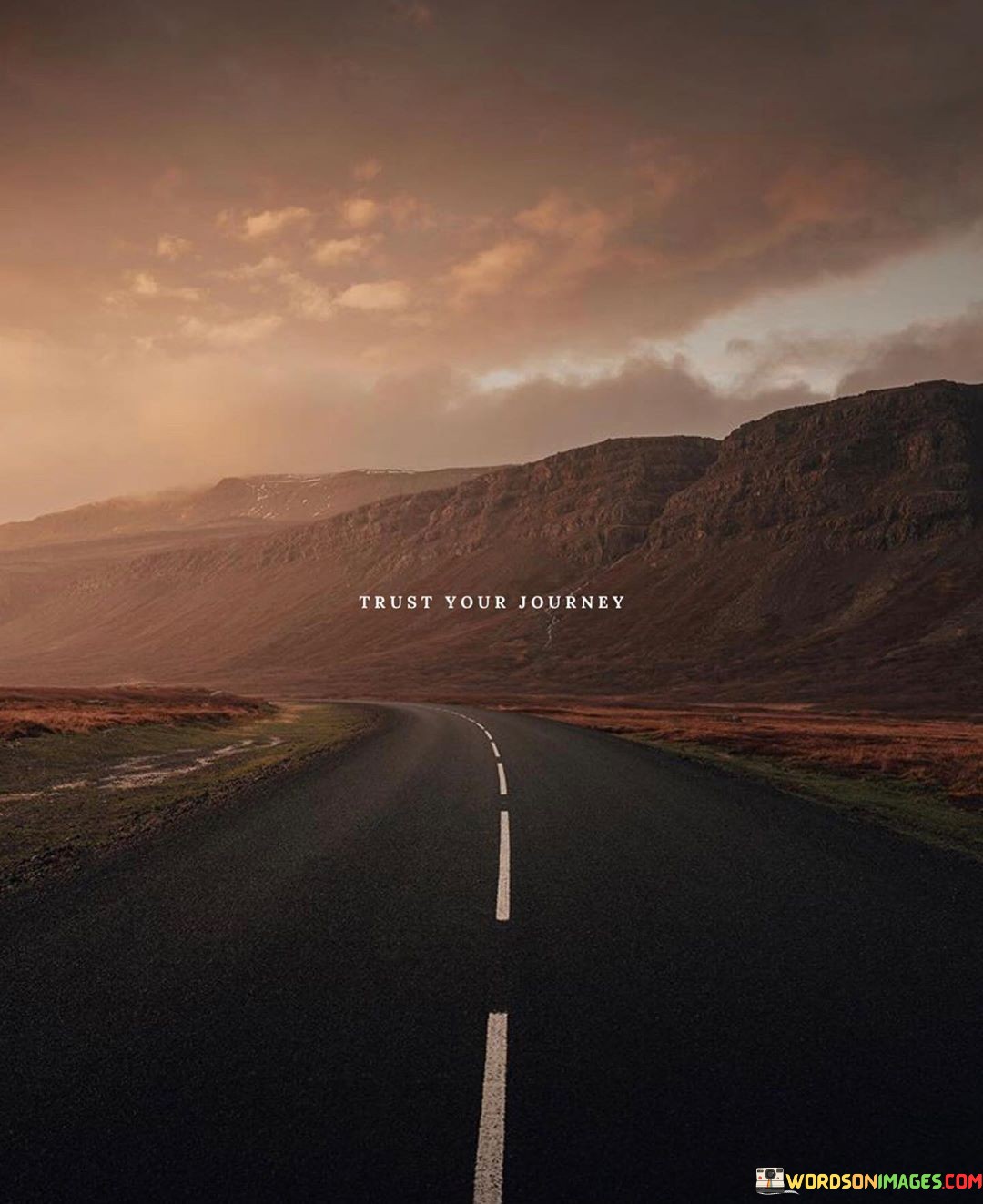 In essence, the phrase serves as a reminder to embrace the uncertainties and challenges of life with self-assurance. It encourages individuals to have patience, resilience, and a positive outlook, even in the face of difficulties. "Trust your journey" speaks to the importance of believing in one's ability to overcome obstacles, learn from experiences, and evolve. It emphasizes that each step, no matter how challenging or uncertain, contributes to personal growth and the creation of a fulfilling life story.