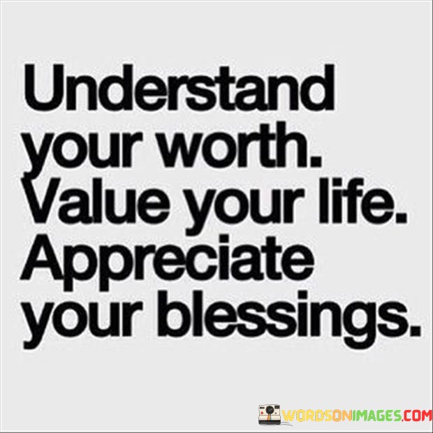 The quote's "Understand Your Worth" implies self-acknowledgment and empowerment. "Value Your Life" suggests cherishing life's experiences, fostering a fulfilled outlook. "Appreciate Your Blessings" prompts reflection, fostering humility and positive perspective. Ultimately, the quote encapsulates self-esteem, mindfulness, and gratitude, guiding a fulfilling, contented life journey.