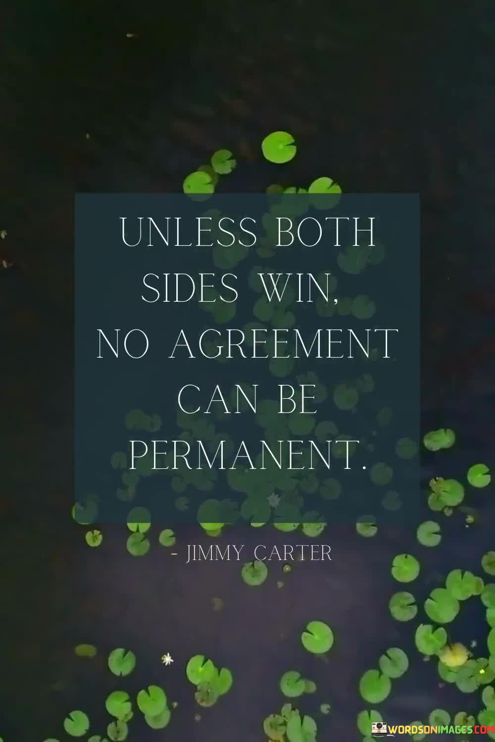 This quote emphasizes the importance of finding mutually beneficial solutions in any negotiation or agreement. It suggests that for an agreement to stand the test of time and be sustainable, both parties involved must feel like they have achieved their objectives and gained something of value.