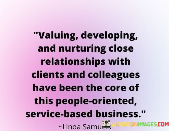 "Valuing, Developing, And Nurturing Close Relationships With Clients And Colleagues" underscores the pivotal role of interpersonal connections. The quote reflects the foundation of a service-oriented business, where genuine relationships are prioritized. This approach leads to mutual growth, trust, and collaboration, fostering a harmonious and productive work environment.