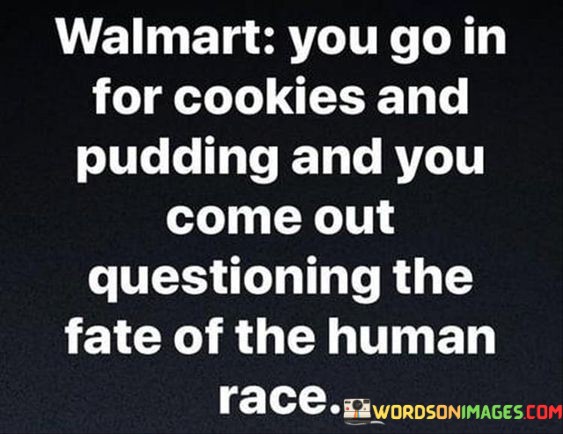 This humorous observation captures the bewildering experience of shopping at Walmart. It playfully suggests that the vastness and variety of products can lead to contemplation about consumerism's impact on society and the environment.