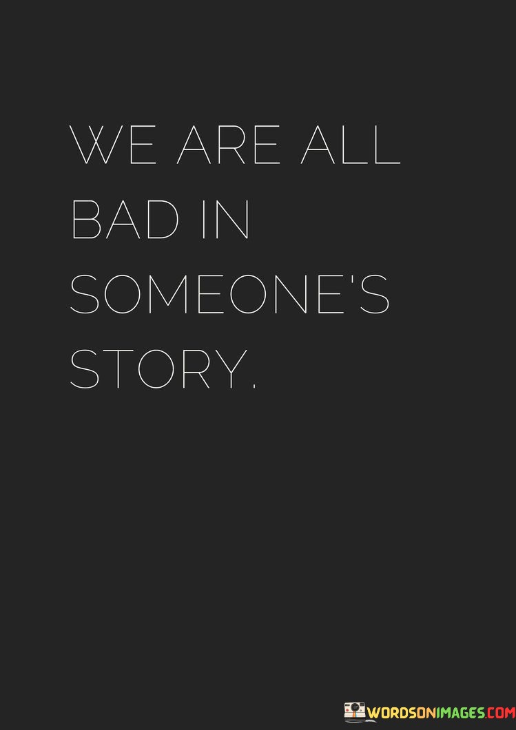 The quote reflects the subjectivity of perceptions and judgments. "We are all bad" signifies potential negative portrayal. "In someone's story" implies different perspectives. The quote conveys that individuals can be viewed negatively from another person's point of view.
