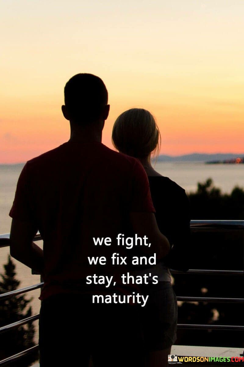 This statement succinctly defines maturity in the context of a relationship. It emphasizes that maturity is not the absence of conflicts but rather the ability to navigate those conflicts, resolve them, and choose to stay together.