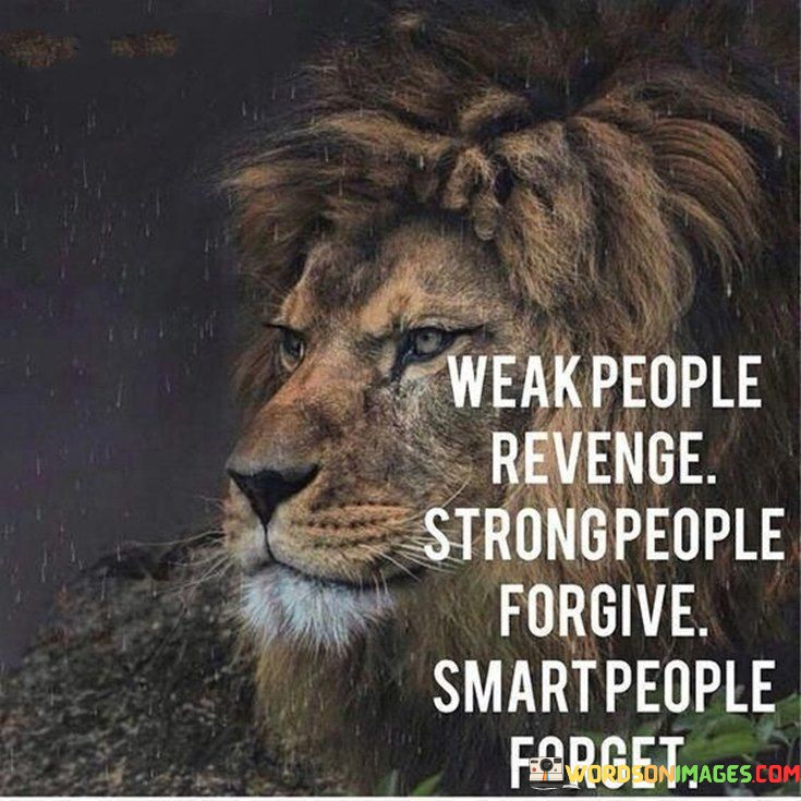 The statement "Weak people revenge, strong people forgive, smart people forget" highlights different approaches that individuals may take in response to negative experiences or conflicts. Weak people revenge: This suggests that individuals who lack emotional strength or resilience may resort to seeking revenge as a way to cope with hurt or anger. Instead of dealing with their emotions constructively, they may feel the need to retaliate and inflict pain on others. Strong people forgive: Strong individuals possess the emotional maturity and strength to forgive others who have wronged them. Forgiveness does not mean condoning or excusing the actions of others, but rather, it involves letting go of resentment and the desire for revenge. By forgiving, they free themselves from the burden of holding onto negativity and find inner peace. Smart people forget: Smart individuals understand that holding onto grudges and dwelling on past hurts can be counterproductive. They recognize the wisdom in letting go of negative experiences and memories that no longer serve them. Forgetting, in this context, does not mean erasing the past but rather choosing not to allow it to dictate their present and future. Each approach reflects different levels of emotional intelligence and coping mechanisms. While revenge may provide temporary satisfaction, it often perpetuates a cycle of negativity and harm. On the other hand, forgiveness and the ability to let go contribute to personal growth and emotional well-being.