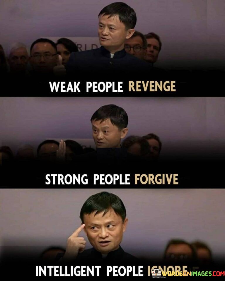 The quote "Weak people revenge, strong people think, intelligent" draws attention to the contrasting ways individuals handle conflicts and challenges. It suggests that while weak individuals may resort to revenge as a response to perceived wrongs, strong and intelligent individuals choose a more thoughtful and strategic approach to address difficult situations. Revenge is often driven by emotions such as anger, hurt, or a desire for retribution. Weak individuals may feel powerless or overwhelmed by negative emotions, leading them to react impulsively without considering the consequences of their actions. However, revenge rarely leads to positive outcomes and can perpetuate a cycle of hostility and negativity. On the other hand, strong individuals exhibit emotional resilience and self-control. Instead of acting out of anger or frustration, they take a step back to analyze the situation objectively. They understand that impulsive actions driven by emotions are unlikely to result in productive resolutions. Furthermore, intelligent individuals prioritize problem-solving and long-term solutions. They recognize that revenge may provide temporary satisfaction but will not lead to genuine resolution or personal growth. Instead, they focus on understanding the root causes of the conflict and identifying ways to address the underlying issues.