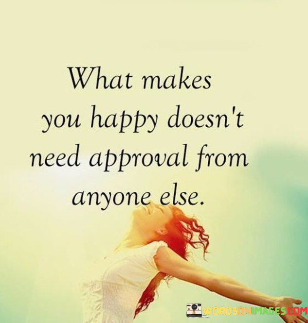 This quote emphasizes the importance of self-validation and individuality in finding happiness. It suggests that our personal sources of joy should not be contingent upon the approval or validation of others. Instead, our happiness should be rooted in our own passions, desires, and inner satisfaction.