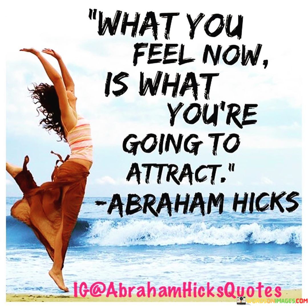 The quote suggests a connection between emotions and the law of attraction. It implies that one's current emotional state influences what they manifest in life. By focusing on positive feelings, individuals can draw similar energy and experiences, emphasizing the importance of cultivating a mindful and positive mindset.