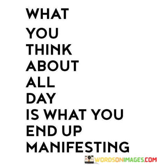The quote, "What you think about all day is what you end up manifesting," conveys a profound message about the power of our thoughts and their influence on our reality. It suggests that our dominant thoughts and mental focus play a significant role in shaping our experiences and outcomes in life. The quote emphasizes the concept of manifestation, which refers to the process of turning thoughts, desires, and intentions into tangible realities. Our thoughts are like seeds planted in the fertile soil of our minds, and what we nurture with our consistent focus and belief can eventually manifest in our lives. By acknowledging the link between our thoughts and the outcomes we attract, the quote urges us to cultivate a positive and constructive mindset, as our thoughts have the potential to shape our actions, decisions, and ultimately, the course of our lives. It serves as a powerful reminder of the importance of mindfulness, positivity, and intentionality in our thought patterns, empowering us to manifest the life we desire through the power of focused and purposeful thinking. At its core, the quote celebrates the principle that our thoughts are creative forces that have the potential to shape our reality. What we consistently think about and dwell upon becomes our predominant mental state, influencing our emotions and behaviors. When our minds are filled with positive, optimistic, and focused thoughts, we are more likely to take constructive actions and make decisions aligned with our goals and desires, setting in motion a chain of events that lead to their realization. Moreover, the quote speaks to the concept of the law of attraction, which posits that like attracts like. According to this principle, our thoughts emit vibrations that draw similar energies and circumstances into our lives. When we consistently focus on positive outcomes and visualize success, we attract opportunities and experiences that align with our aspirations, leading us closer to the fulfillment of our desires. Furthermore, the quote underscores the significance of mindfulness and self-awareness in harnessing the power of manifestation. It urges us to pay attention to our thought patterns and consciously direct our mental focus towards what we wish to create and achieve. By practicing mindfulness, we can catch and redirect any negative or limiting thoughts, replacing them with positive affirmations and beliefs that empower us to manifest our dreams and goals. In conclusion, the quote "What you think about all day is what you end up manifesting" illuminates the profound connection between our thoughts and our reality. By recognizing the creative power of our thoughts, we are encouraged to cultivate a positive and purposeful mindset that aligns with our desires and goals. Through focused and intentional thinking, we have the potential to attract opportunities and experiences that lead to the manifestation of our aspirations. This quote serves as a powerful reminder of the significance of mindfulness, positivity, and self-awareness in shaping our lives, empowering us to embrace the power of our thoughts and become intentional creators of our own destinies. By harnessing the force of our thoughts, we can manifest the life we envision and open ourselves to a world of possibilities and abundance.