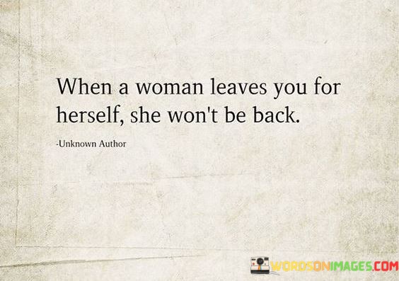 Ultimately, the quote highlights the significance of self-discovery and personal growth in a woman's life. It encourages individuals to respect and support a woman's decision to leave a relationship for herself, understanding that her commitment to her own journey means she is unlikely to return. It serves as a reminder to value and honor one's own personal growth and to foster an environment that supports and encourages the pursuit of self-fulfillment and empowerment.