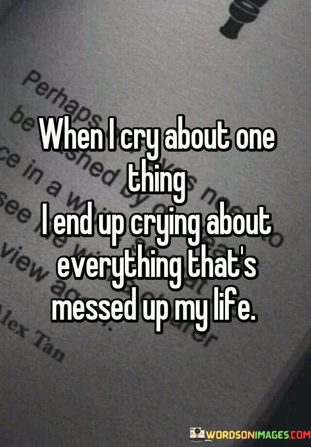 The quote reflects the emotional cascade triggered by distress. "Cry about one thing" signifies initial emotional release. "Crying about everything that's messed up" implies a chain reaction. The quote conveys how one emotional trigger can lead to a flood of pent-up feelings.