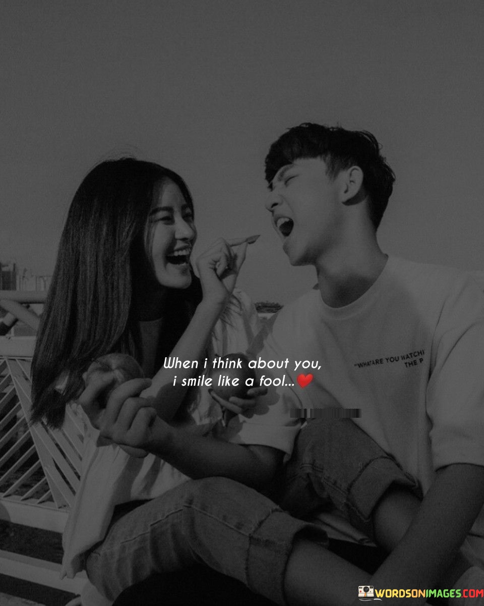 In essence, this quote celebrates the power of affection and fondness. It reflects the way thoughts of a loved one can light up our mood and bring a sense of lightheartedness. The imagery of smiling "like a fool" adds a touch of humor and authenticity, highlighting the carefree and uninhibited joy that accompanies such feelings.