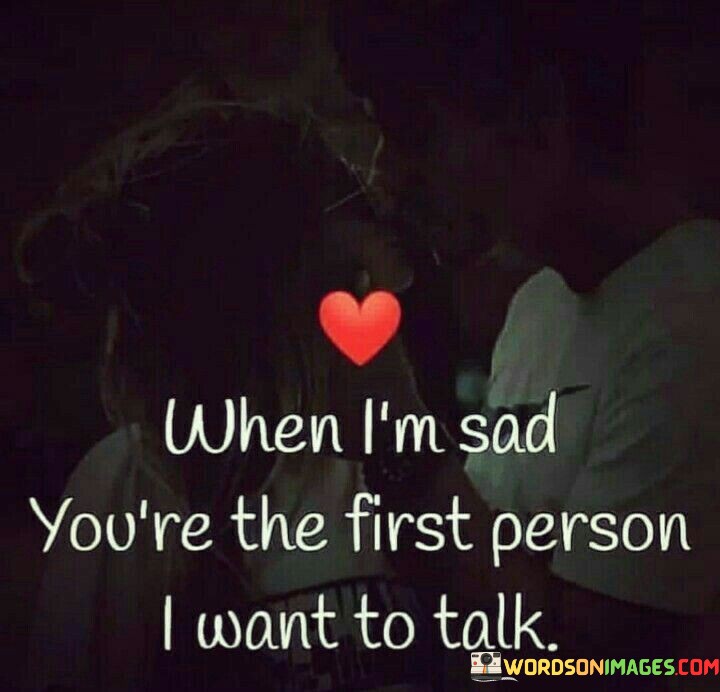 This quote conveys the comfort and emotional connection one person feels toward another during moments of sadness. "When I am sad" signifies vulnerability and distress. "You're the first person I want to talk to" implies that the person seeks solace, understanding, and support from the other, recognizing their role as a source of comfort during difficult times.