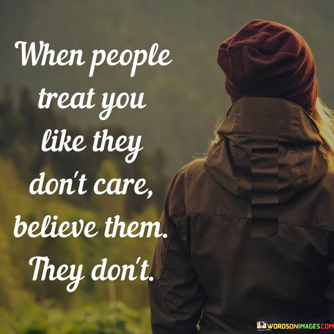 The quote emphasizes the importance of recognizing indifference in behavior. "Treat you like they don't care" implies neglect. "Believe them they don't" underscores that actions speak louder than words. The quote advises against denying the reality of indifference.