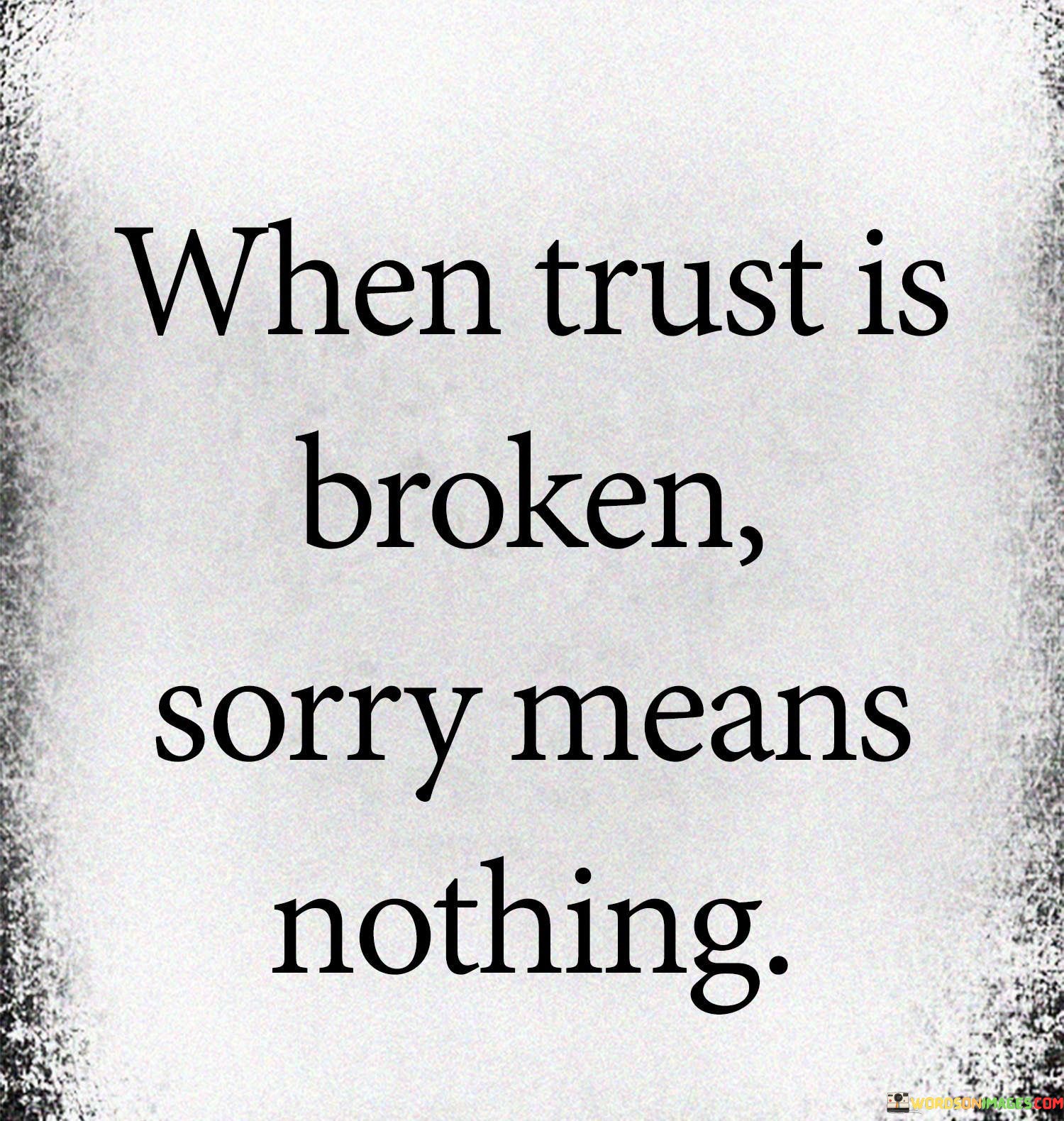 The quote highlights the fragility of trust in relationships. "Trust is broken" signifies a breach of faith. "Sorry means nothing" implies the insufficiency of an apology. The quote conveys the idea that trust, once damaged, cannot easily be repaired solely through verbal apologies.