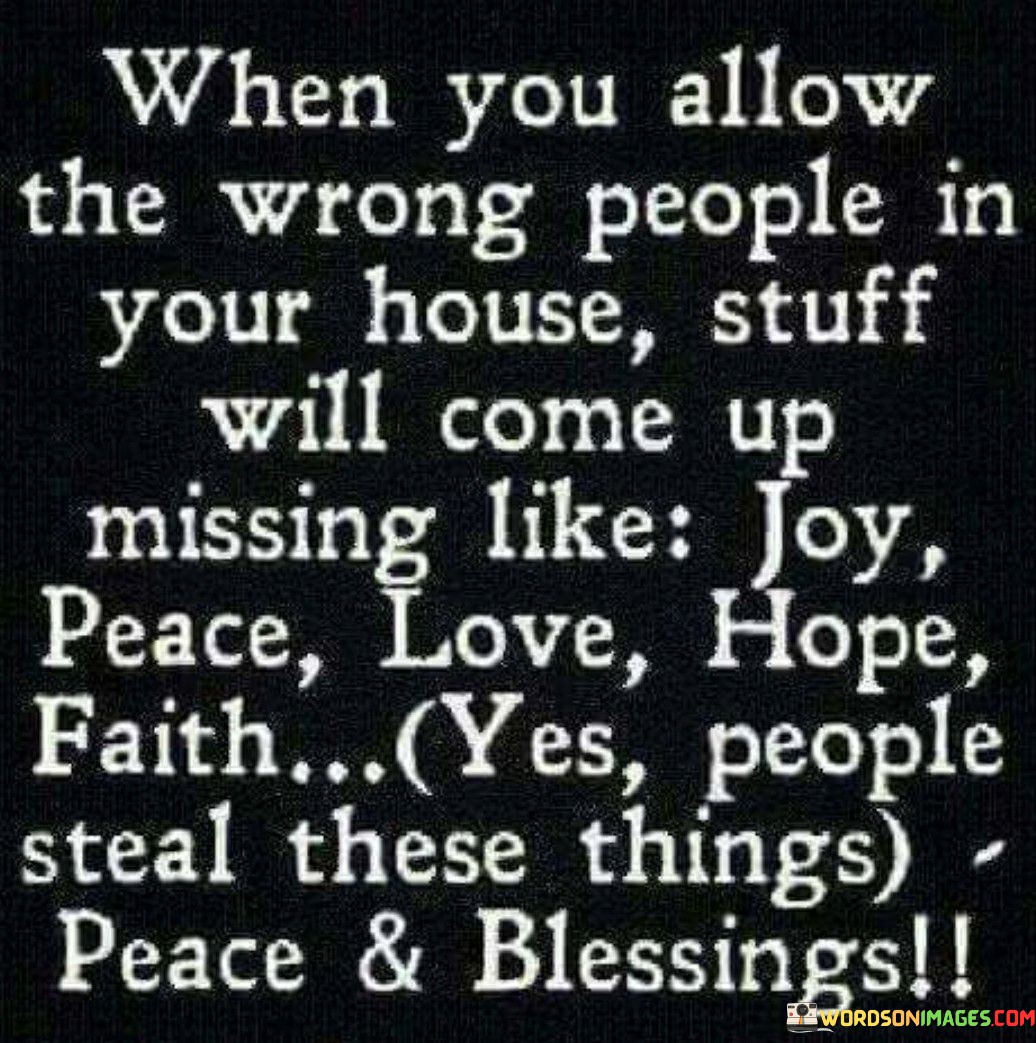 The statement cautions against allowing negative influences into one's life, as they can take away positive qualities such as joy, peace, love, hope, and faith. It implies that negative individuals can steal these precious attributes, leaving behind turmoil and discord. By emphasizing the importance of surrounding oneself with positive influences, the statement underscores the transformative power of choosing healthy relationships.