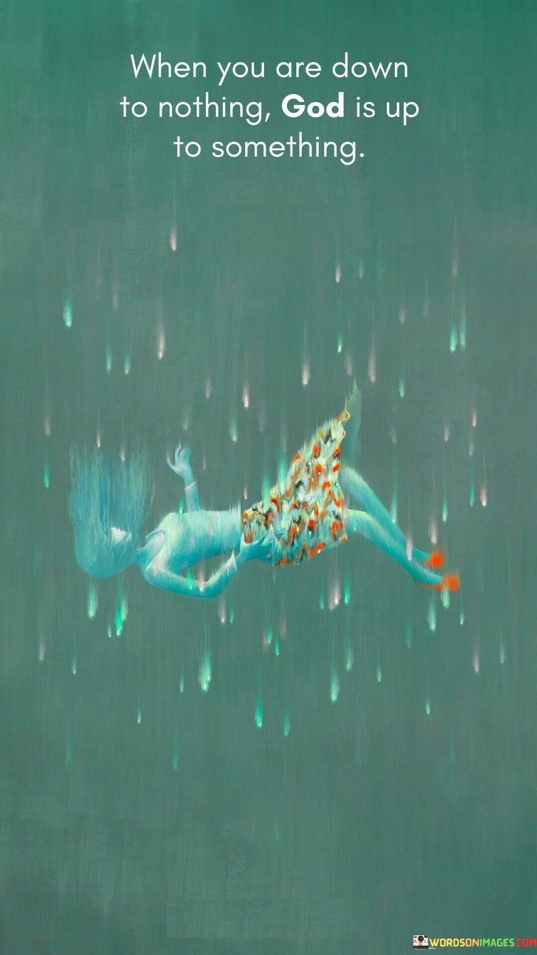In essence, "When you are down to nothing, God is up to something" serves as a reminder to trust in divine providence and to maintain hope even in the face of adversity. It signifies the belief that God can bring about positive change and blessings, even when circumstances appear bleak.