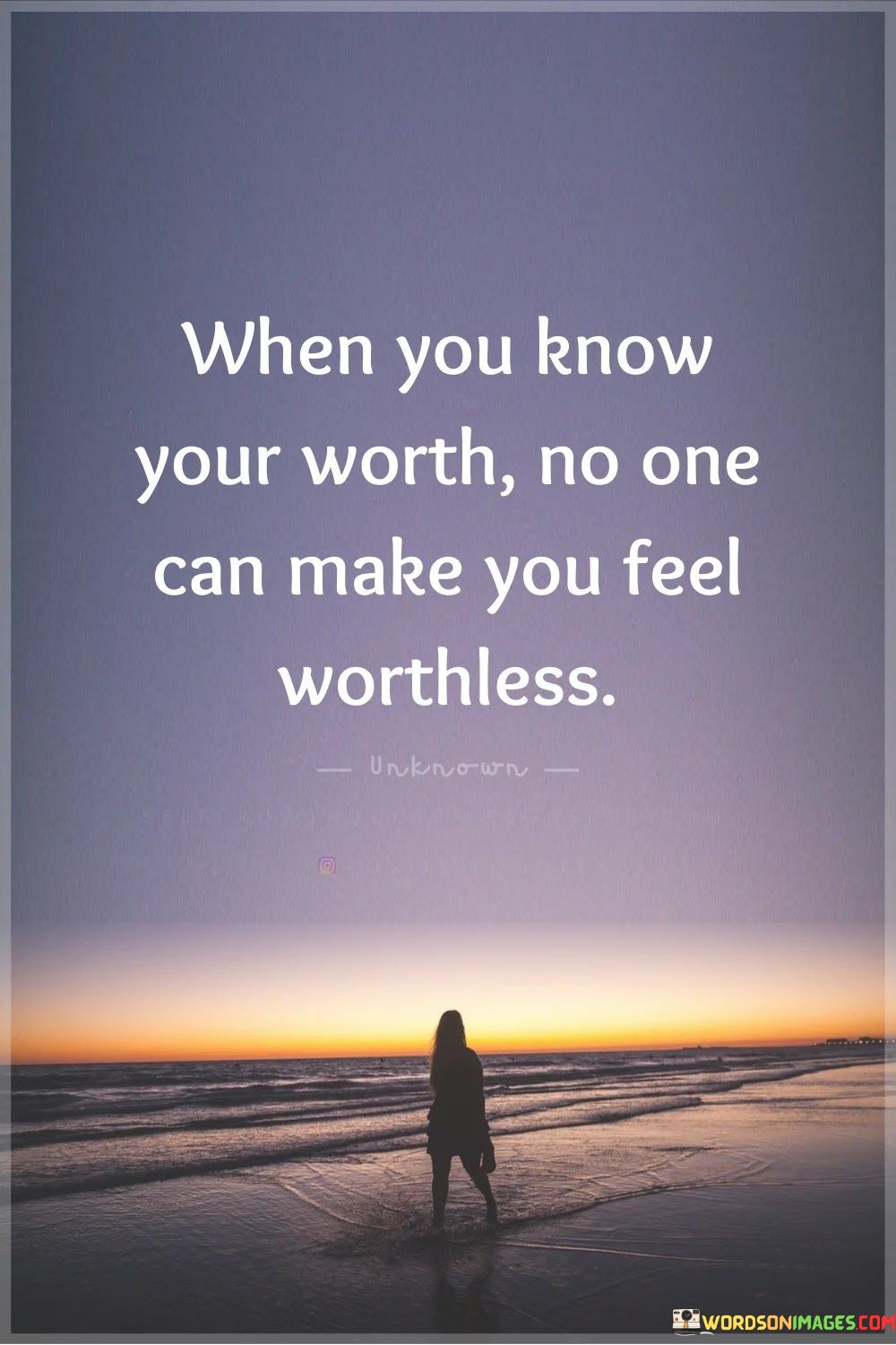Ultimately, this quote empowers individuals to maintain a positive self-image. It serves as a reminder that when individuals acknowledge their own worth, they become less susceptible to others' attempts to diminish their self-esteem, fostering confidence and inner strength.