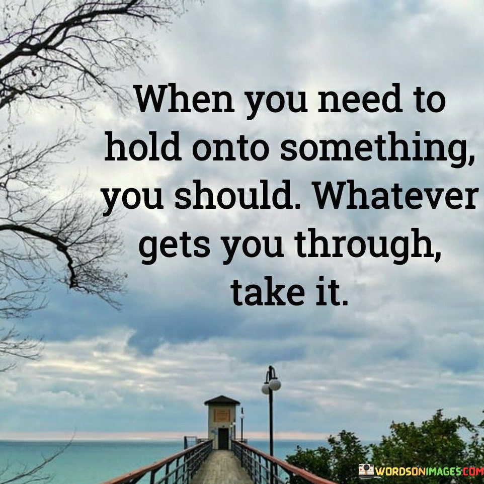 The quote "When you need to hold onto something, you should, whatever gets you through, take it" conveys a message of comfort and support during challenging times. It acknowledges that in moments of difficulty, people may seek solace and coping mechanisms to navigate through their struggles, and it encourages them to embrace whatever brings them comfort and strength. Life is filled with ups and downs, and during the lows, individuals often need something to hold onto, whether it be a belief, a hobby, a support system, or a coping strategy. The quote recognizes the diverse ways people find strength and resilience when faced with adversity. What may provide comfort and support for one person may not be the same for another, and that is perfectly acceptable. Moreover, the quote emphasizes the importance of self-compassion and understanding. When individuals face challenging situations, they should be gentle with themselves and not feel guilty or ashamed for seeking sources of comfort or support. The journey through difficult times can be tough, and whatever helps individuals get through it should be embraced without judgment.
