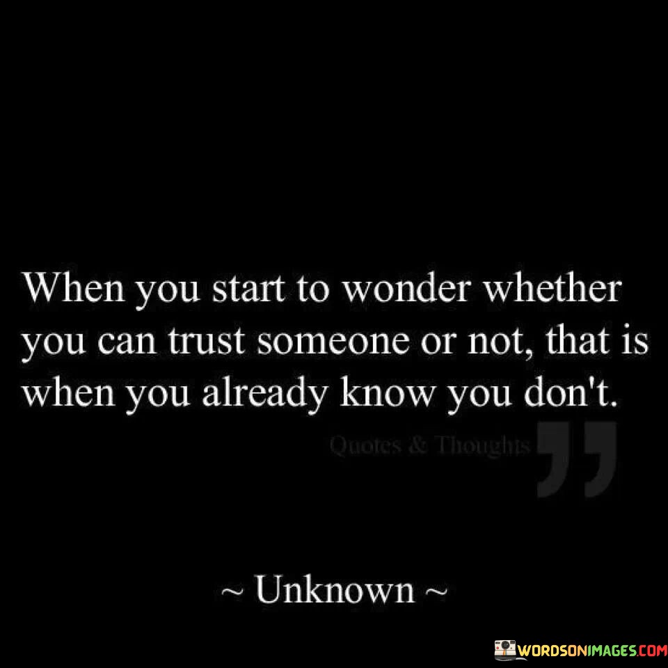 The quote "when you start to wonder whether you can trust someone or not, that is when you already know you don't" highlights the intuitive nature of trust assessment. It suggests that the mere doubt about someone's trustworthiness indicates an underlying lack of confidence in their intentions or actions.