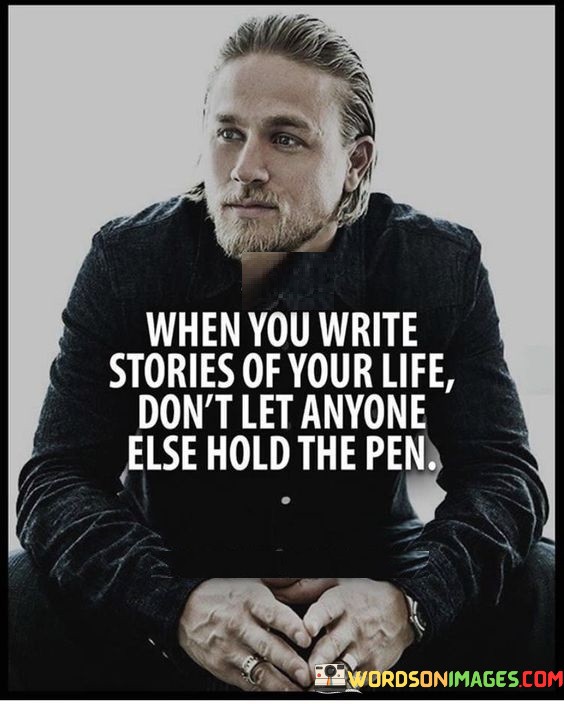 The quote highlights the power of self-expression and autonomy. It implies that personal stories should be crafted from one's own perspective. By advising not to allow others to "hold the pen," it underscores the idea of preserving one's voice and authenticity in shaping their life's narrative.