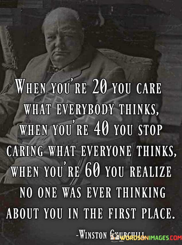 This quote reflects the evolution of perspective and priorities as one ages. In your 20s, there's often a strong concern about others' opinions, driven by a desire for social acceptance and validation. As you reach your 40s, this preoccupation tends to wane, and you become more focused on your own beliefs and values, caring less about external judgments.