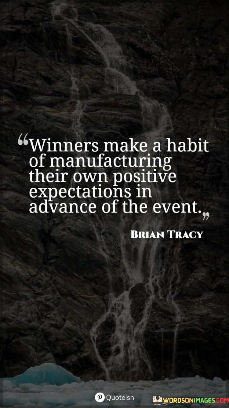 This quote suggests that successful individuals have a tendency to proactively create optimistic expectations prior to an event, which contributes to their achievements and positive outcomes. "Winners make a habit of manufacturing their own positive expectations in advance of the event" implies that those who consistently achieve success have a practice of cultivating a positive mindset and envisioning favorable outcomes before they even occur. This mental preparation helps them approach challenges with confidence and determination.