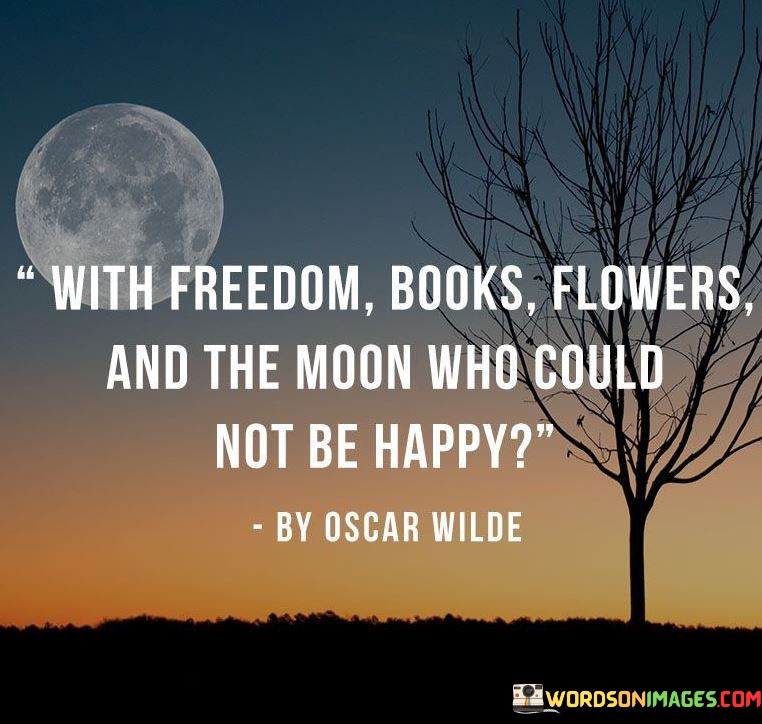 The quote celebrates the simple joys of life that bring happiness. It highlights four elements that evoke feelings of freedom and contentment: freedom itself, the knowledge and escape found in books, the beauty and serenity of flowers, and the enchanting allure of the moonlit sky.