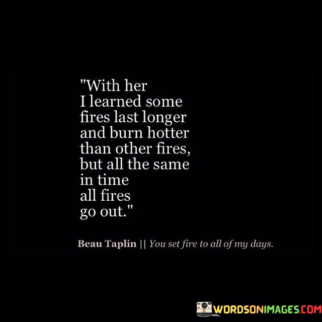 This quote reflects on the varying intensity and duration of emotions and relationships. It suggests that while some passions are intense and enduring, ultimately, all feelings come to an end. In the first part, "With Her I Learned Some Fires Last Longer and Burn Hotter Than Other Fires," the quote acknowledges the diversity of emotional experiences and the differing levels of intensity.