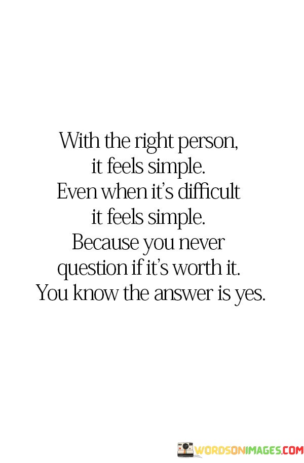 The quote "with the right person, it feels simple even when it's difficult; it feels simple because you never question if it's worth it, you know the answer is yes" captures the essence of a harmonious and meaningful relationship. It suggests that genuine connections are marked by ease, even during challenging times, due to a deep-seated certainty about their value.