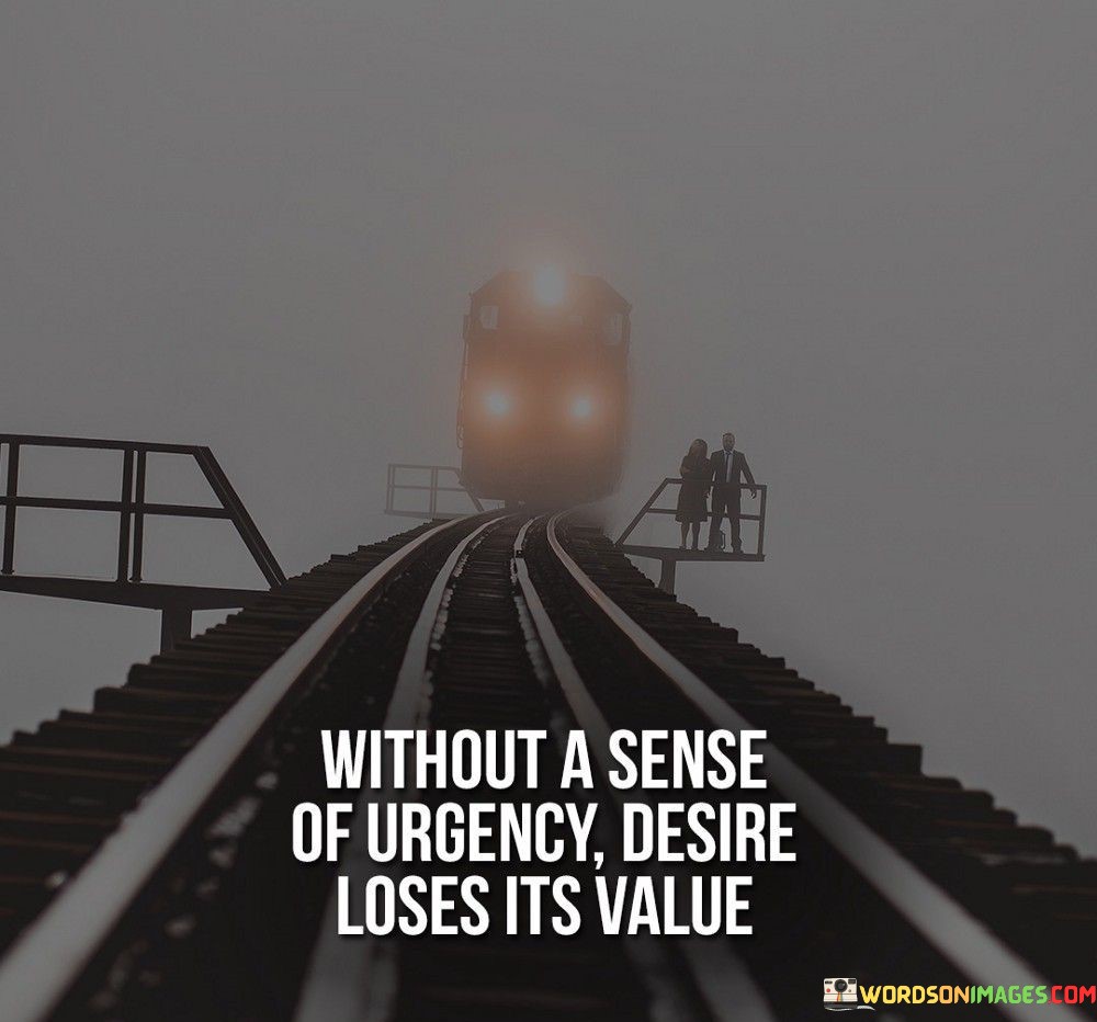 The quote "Without a sense of urgency, desire loses its value" highlights the critical role that urgency plays in fueling and sustaining our desires and ambitions. It suggests that when we lack a sense of urgency, our desires may lose their significance and become less compelling, ultimately leading to a lack of motivation and drive to pursue them. Urgency creates a sense of importance and immediacy around our desires. When we feel a pressing need to act or achieve something, our desires hold greater weight and significance in our lives. This sense of urgency propels us to take action, make necessary changes, and work diligently towards fulfilling our aspirations. Moreover, urgency amplifies our commitment and determination. When we recognize that time is of the essence, we become more focused and dedicated to accomplishing our goals. Urgency drives us to prioritize our desires and allocate our resources wisely, ensuring that we are proactive in our pursuit of what we truly want. Furthermore, urgency serves as a catalyst for progress and growth. It pushes us out of our comfort zones and encourages us to embrace challenges and embrace change. The desire to achieve something meaningful within a limited timeframe compels us to be resourceful, resilient, and innovative in finding solutions. On the other hand, without a sense of urgency, complacency can set in, and our desires may lose their allure. Procrastination and hesitation can hinder our progress, leading to missed opportunities and unfulfilled potential. When we lack urgency, our desires may become distant dreams rather than attainable goals.