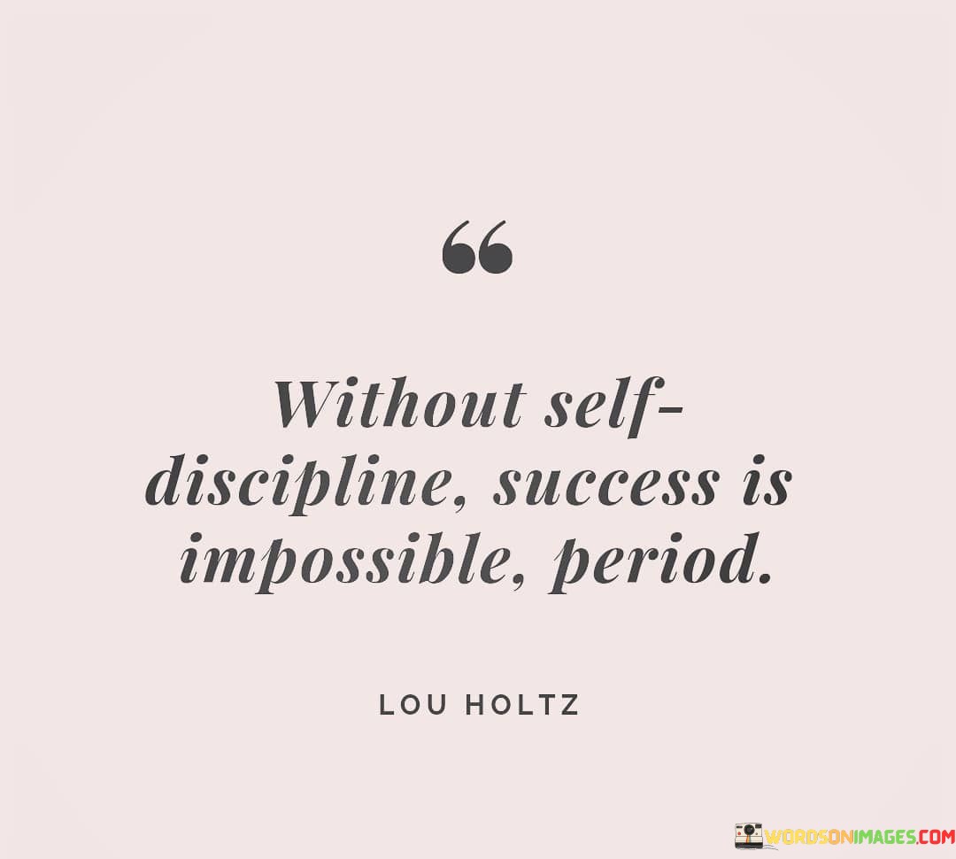 The quote "Without self-discipline, success is impossible. Period." emphasizes that self-discipline is an essential prerequisite for achieving success. It unequivocally states that without the ability to control one's actions and choices, realizing success is unattainable.