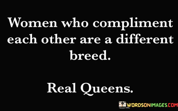 The quote "women who compliment each other are a different breed, real queens" conveys a powerful message about the importance of uplifting and supporting one another among women. It suggests that when women genuinely and sincerely compliment each other, it signifies a distinct level of maturity, confidence, and empathy. The term "real queens" highlights the regal and dignified nature of women who exhibit this behavior, indicating that true strength lies in unity and uplifting others.In a world that sometimes fosters competition and comparison among women, this quote reminds us of the strength that comes from building each other up rather than tearing each other down. It celebrates the unique bond that emerges when women authentically appreciate and compliment one another, fostering a sense of sisterhood and empowerment. By embracing each other's strengths and accomplishments, women can collectively rise and create a positive, supportive environment that nurtures personal growth and collective success.