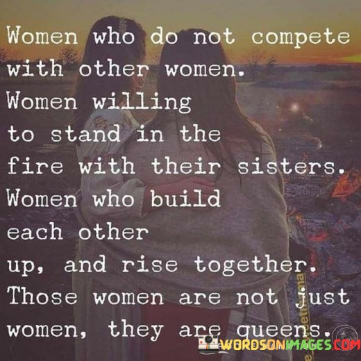 The quote exalts the virtues of women who choose not to engage in unhealthy competition with their fellow women. It celebrates women who prioritize solidarity and support among their gender, willingly facing challenges and difficulties alongside their sisters. Instead of tearing each other down, these women strive to build each other up and empower one another. The quote highlights the strength and beauty in such sisterhood, suggesting that women who uplift and collaborate with one another are not merely ordinary women, but queens in their own right.By advocating for a culture of non-competitive sisterhood, the quote emphasizes the importance of unity and camaraderie among women. It challenges the prevalent notion of women being pitted against each other in various aspects of life, be it in the workplace, relationships, or societal expectations. The image of "standing in the fire with their sisters" metaphorically represents their willingness to face adversity and support each other through difficult times. It paints a picture of resilience and togetherness, where women draw strength from their shared experiences and triumphs.Moreover, the quote emphasizes the transformative power of such a positive approach to womanhood. By raising each other up, women can collectively enhance their abilities, amplify their voices, and achieve greater success. This supportive network of women acts as a strong foundation for personal growth and societal progress, where queens, not in the sense of royalty, but in terms of leadership, arise to inspire and influence others positively.Ultimately, the quote serves as a call to action for women to embrace their collective power and transform the narrative surrounding women's relationships. By encouraging mutual support, empathy, and respect, women can create a world where they uplift each other and collectively ascend to heights beyond the limitations of societal expectations. It reminds us that true empowerment comes from unity, fostering an environment where all women can thrive and shine as queens in their own unique ways.