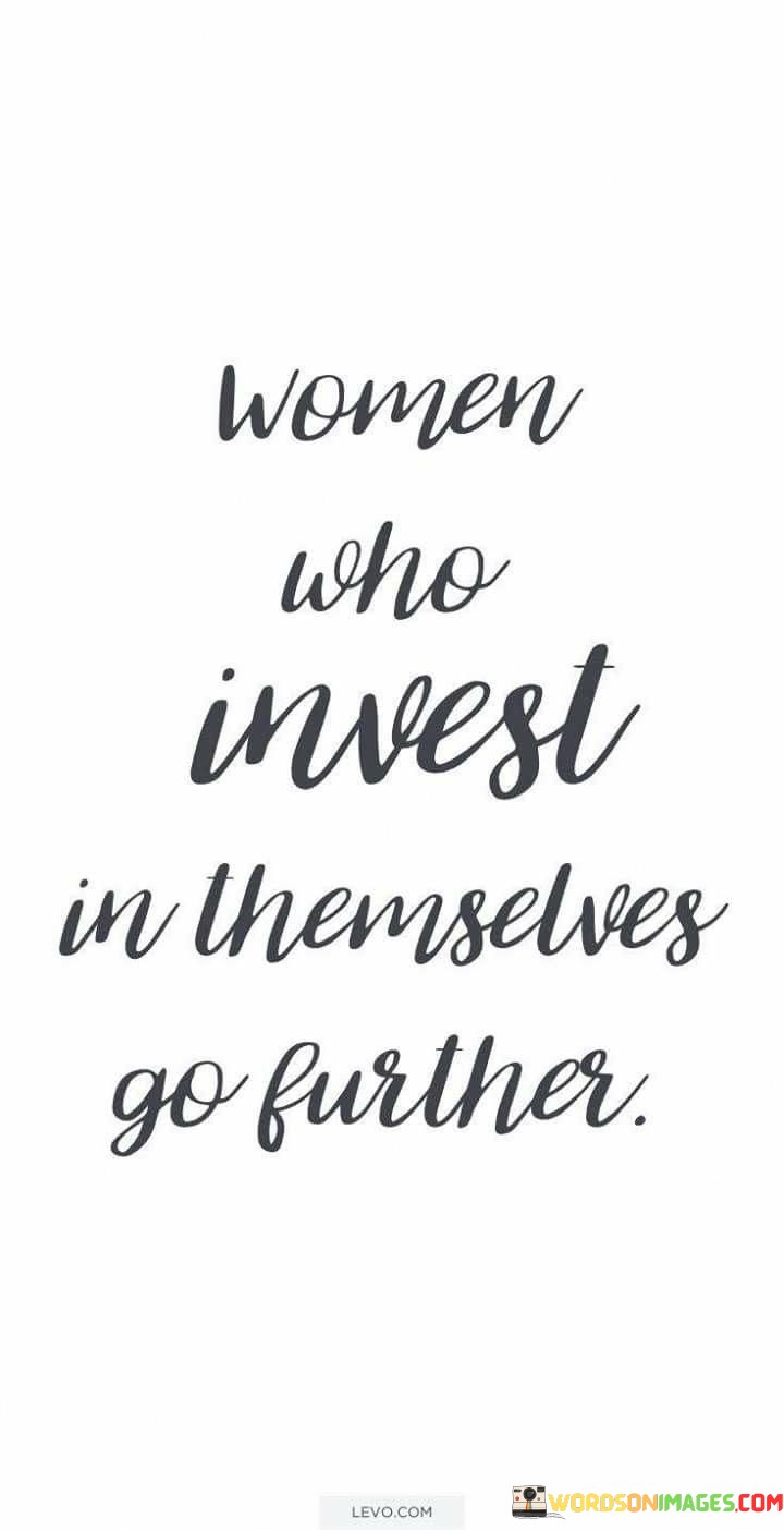 This powerful statement emphasizes the significance of self-investment for women's personal and professional growth. When women prioritize their own development, education, skills, and well-being, they pave the way for greater success and fulfillment in various aspects of life.