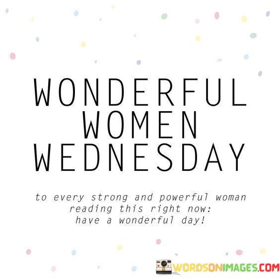 The quote "To every strong and powerful woman reading this right now, have a wonderful day" is a heartfelt message of encouragement and appreciation directed towards women who possess strength, resilience, and power. It acknowledges the inherent fortitude and capabilities that women embody, recognizing their contributions to society and their ability to overcome challenges. By addressing these women directly, the quote aims to uplift and inspire, reminding them of their worth and the positive impact they have on the world.In a society that sometimes undervalues or underestimates the strength of women, this quote serves as a reminder of their significance and celebrates their achievements. It recognizes that women are multi-faceted beings, capable of great accomplishments, and emphasizes the importance of self-care and well-being by wishing them a wonderful day. By using the terms "strong" and "powerful," the quote challenges traditional gender norms and promotes empowerment, fostering a sense of unity among women who share these qualities.Furthermore, the quote holds a sense of camaraderie, acknowledging the interconnectedness of women and the support they can provide one another. It encourages women to stand tall and embrace their strength, while also acknowledging their right to enjoy happiness and positivity in their daily lives. Ultimately, this uplifting message serves as a testament to the resilience and potential of every strong and powerful woman, inspiring them to continue their journey with confidence and grace.
