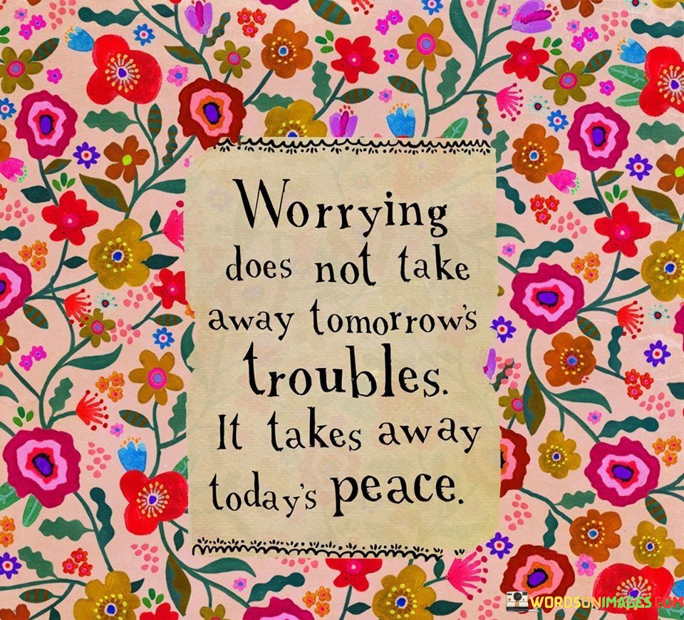 The quote speaks to the futility of worrying and its impact on the present and future. "Worrying doesn't take away tomorrow's troubles" conveys that worrying doesn't preemptively solve future challenges.