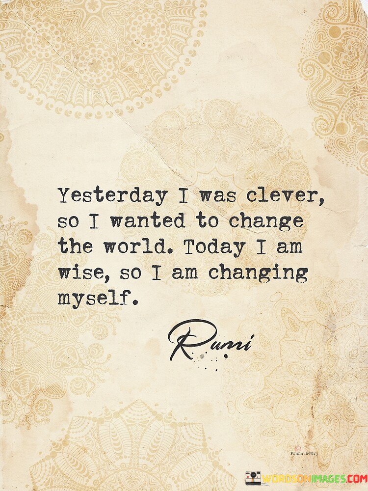The quote captures the evolution of personal growth and wisdom over time. In the first paragraph, "yesterday I was clever, so I wanted to change the world" signifies youthful ambition and a desire to impact the world. This reflects an initial perspective driven by idealism and the belief in one's ability to create broad change.