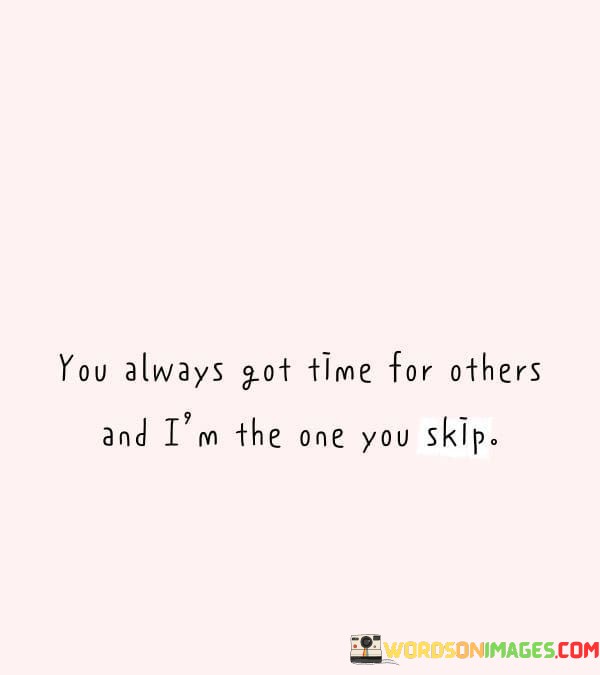 This quote reflects the feeling of being neglected or overlooked in a relationship where someone consistently makes time for others but not for you. It expresses the frustration of not receiving the same attention and care. The first part, "You Always Have Time for Others," points out the contrasting behavior in giving time to others.
