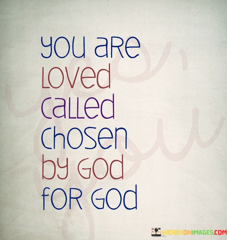 This quote affirms the belief that individuals are loved, called, and chosen by God for His purposes. In a single sentence, it suggests that people are recipients of God's love and have a divine calling and purpose.