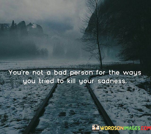 The quote provides solace and understanding regarding coping mechanisms for sadness. "Not a bad person" conveys self-acceptance. "Ways you tried to kill your sadness" alludes to various strategies for emotional relief. The quote emphasizes the importance of self-compassion in dealing with emotional struggles.