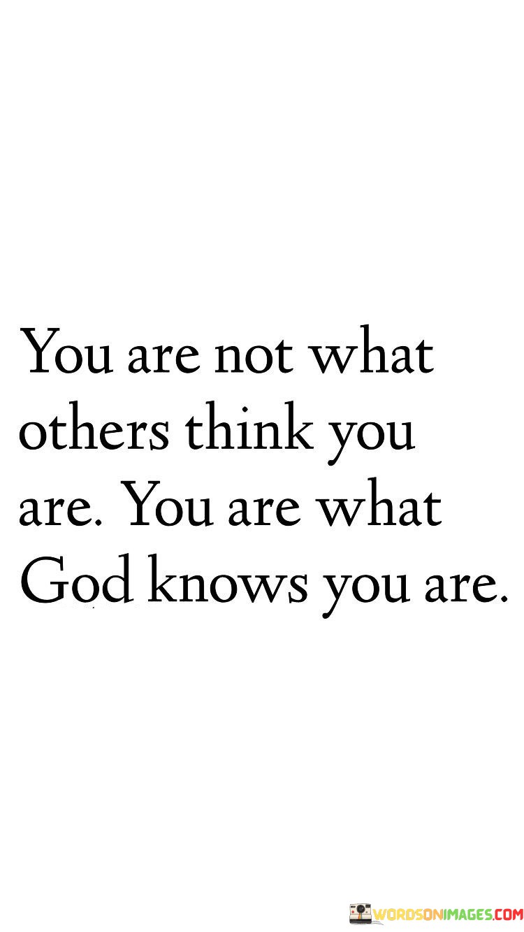 The quote "You Are Not What Others Think You Are, You Are What God KNOWS YOU ARE" conveys a powerful message of self-worth and identity rooted in one's relationship with a higher power. It suggests that a person's true essence and value are not determined by the opinions or judgments of others but are defined by God's knowledge and perception of them.
