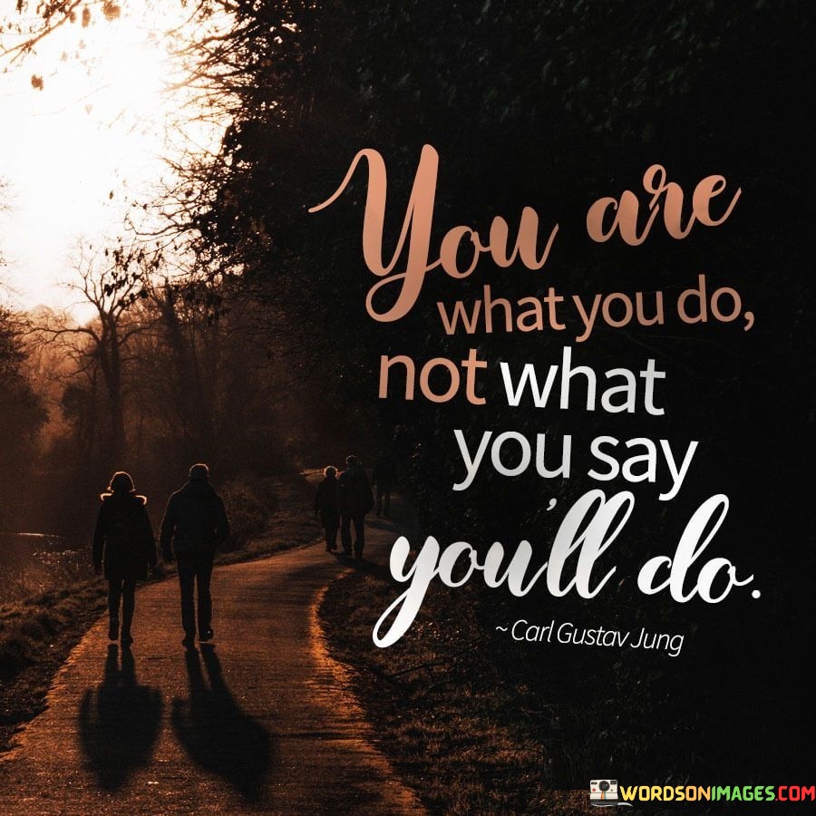 The quote "You are what you do, not what you say you'll do" emphasizes the importance of actions over words in defining one's character and identity. It highlights the significance of integrity and consistency in how we conduct ourselves and how we are perceived by others.